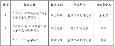 2023年9月28日,湖北开放大学发布关于学习推广“特色教学质量管理模式”的通知,我校申报的“‘三位一体贯通融通’特色教学质量管理模式”、和“‘三一三’导学模式”通过评审,并被评选为全省开大体系特色教学质量管理模式。